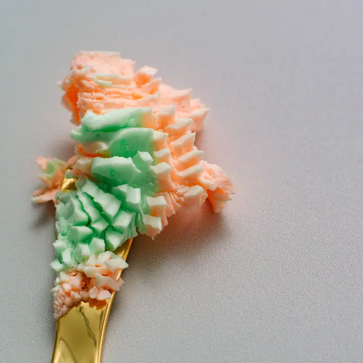 Beurre de karité biologique, beurre de coco, beurre de mangue, huile de noix de coco, huile de jojoba, vitamine E, parfum, mica cosmétique