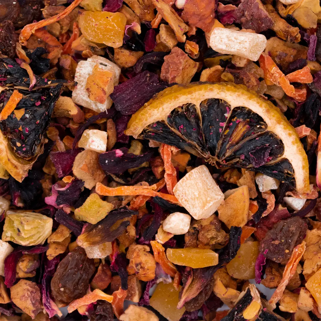 Pomme, raisin (raisin, huile végétale), hibiscus, ananas (ananas, sucre), mangue (mangue, sucre), carotte, papaye (papaye, sucre), betterave rouge, arôme naturel, morceaux de citron, tranches de kiwi, pétales de rose.
